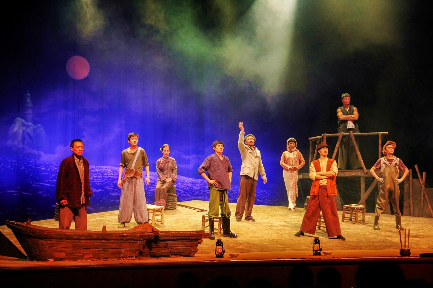 这是一部需要静下心来看的作品,有着熟普一样的丰润内涵和朴实情感,越品越有味。我看了两遍,下午和晚上的演出我都在观众席里,台上的演员越演越给劲,毫无连演两场的疲惫。当船工号子响起,船头在烟雾缭绕中由两边慢慢滑向舞台中央时,我被震撼到了。很久没有由心底深处发出的感动了,尽管不生活在海边,但人类朴实的情感是共通的。我们怀念人与人之间真挚情感互通的时代,憧憬人与自然和平共生未来。“海水是咸的,那是我们的泪,是人的,也是鱼的”,希望有一天,海水是甜的,充满幸福的味道,是鱼的,也是人的。