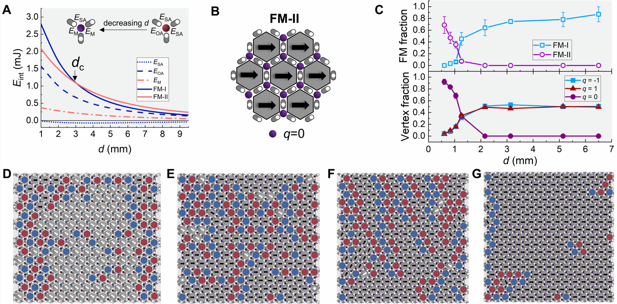 该研究首创逐个赝自旋生长方式,如同单晶生长般在kagome结构中有序引入相互作用单元,确保局部相互作用能和整体相互作用能的最小化,使系统自发形成磁荷-自旋双重长程有序的基态磁结构,解决了困扰领域十余年的基态有序相难题。该研究进一步开发“磁梳”技术,利用磁体阵列实现晶格长程有序态和高度简并无序态的可逆擦写(图2)。这一宏观尺度的磁态操控为研究磁畴动力学提供了直观平台。该研究进一步展示了在极端集体作用强度下,传统人工冰阻挫体系的崩塌及全新有序相的形成,首次发现了Kagome晶格结构中全新的长程有序铁磁II相,揭示了阻挫体系中集体相互作用的新规律。